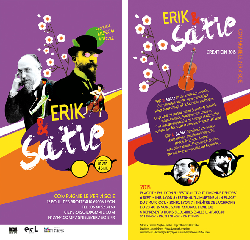 Affiche et flyer pour une série de représentations du spectacle Erik & Satie de la Compagnie le ver à soie